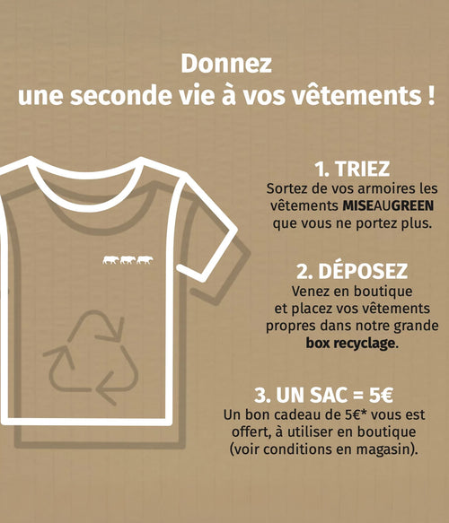 *Bon d’achat de 5€ à valoir uniquement sur votre prochain achat, en boutique Mise au Green, dans les 6 mois suivant le dépôt des articles recyclés (voir conditions en magasin). Cumulable avec les offres en cours. Un seul coupon de 5€ par ticket. Les bons d’achats ne sont ni cumulables, ni remboursables, ni sécables, ni échangeables contre des espèces et non remplacés en cas de perte ou de vol.