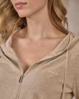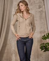 Alliant confort et style, ce cardigan beige chiné à capuche est un basique indémodable ! A son allure sportswear chic sont ajoutées deux poches latérales, une fermeture zippée et des finitions bord-côtes sur les poignets, les poches et le bas du vêtement. Résolument confortable, sa maille fine et souple est composée en coton avec une touche de cachemire. Cette pièce irrésistible est signée d’une broderie Mise au Green ton sur ton sur la poitrine.
