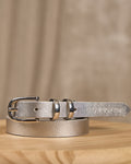 Chic et intemporelle, cette ceinture fine argentée est l’accessoire incontournable de votre garde-robe ! Véritable bijou, elle est sublimée par une boucle dorée et une inscription Mise au Green. Confectionné en cuir, ce modèle polyvalent se porte aussi bien avec un jean qu’une robe pour souligner votre taille. Misez sur son design élégant et épuré pour compléter toutes vos tenues.