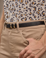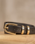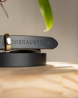 Chic et intemporelle, cette ceinture fine noire est l’accessoire incontournable de votre garde-robe ! Véritable bijou, elle est sublimée par une boucle dorée et une inscription Mise au Green. Confectionné en cuir, ce modèle polyvalent se porte aussi bien avec un jean qu’une robe pour souligner votre taille. Misez sur son design élégant et épuré pour compléter toutes vos tenues.