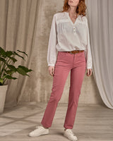 Très polyvalent, ce pantalon 5 poches pour femme est un allié du quotidien. Il est souligné par plusieurs poches à l’avant et à l’arrière, d’une braguette zippée avec bouton et d’un jacron Mise au Green. Grâce à son coloris mauve, créez-vous une multitude de tenues sophistiquées ! Pour plus d’aisance, cette pièce de tous les jours est fabriquée en coton issu de l’agriculture biologique avec une pointe d’élasthanne.