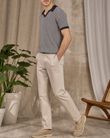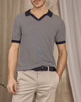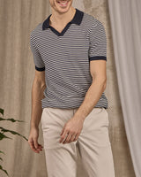 Des finitions côtelées et contrastées au niveau du col, de la base et des manches animent ce polo à manches courtes. Réalisé en coton et lyocell, il garantit confort et douceur tout au long de la journée. Pour un style raffiné, ce modèle à rayures est proposé dans un coloris bleu marine. Associez-le à un pantalon ou à un bermuda pour booster vos tenues estivales !