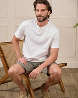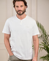 Alternative idéale au tee-shirt à col rond, ce tee-shirt henley est une pièce maîtresse du vestiaire masculin ! Ce modèle à manches courtes est doté de son iconique encolure boutonnée et d’une broderie 3 vaches ton sur ton. Il est proposé en coton issu de l’agriculture biologique pour un porter léger et agréable. À porter seul ou sous un cardigan selon vos préférences !