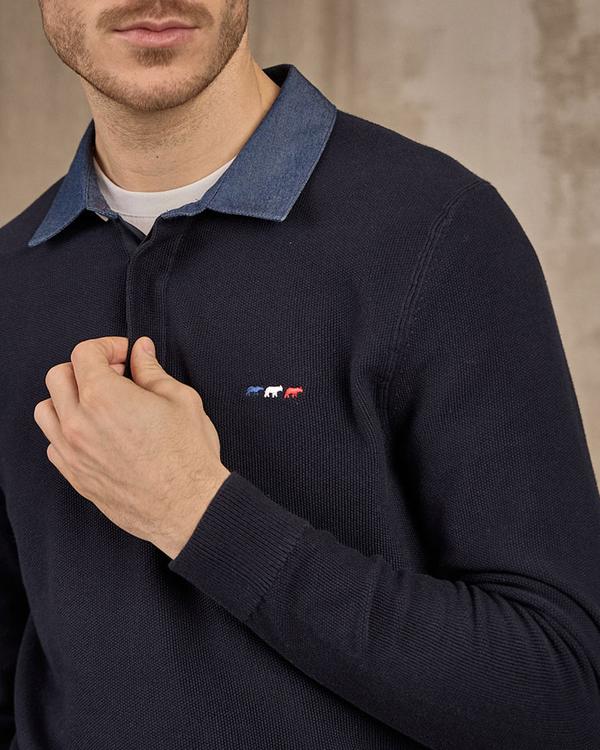 Envie d’un soupçon d’originalité pour votre prochain haut ? Avec son col polo et sa teinte bleu marine, ce pull à manches longues vous suit au quotidien et se porte aussi bien seul que par-dessus un tee-shirt. Très confortable, il est conçu en coton. Un col aspect denim, une patte de boutonnage et un logo tricolore « 3 vaches » apportent du caractère et la personnalité. Avec lui, vous n’avez plus à craindre du fashion faux-pas !