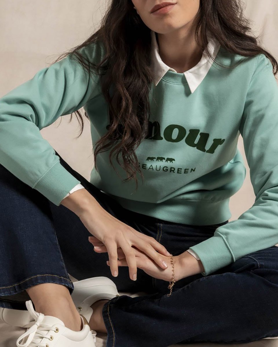 - Le sweat col rond avec inscription “amour” brodé de la collection Automne-Hiver 2024, en pêche et vert sauge pour une touche romantique.