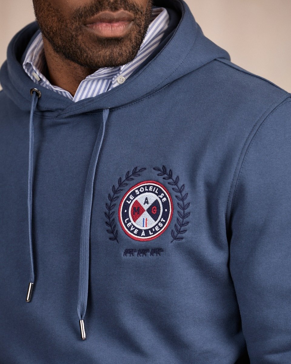 - Les hoodies blason, ornés d’un écusson, sont disponibles en bleu marine, bleu cobalt, vert, vert pomme, beige et rouge, des couleurs dynamiques.